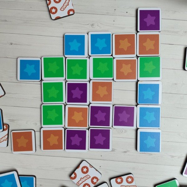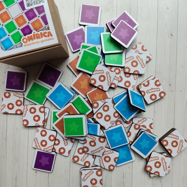 Contiene 72 fichas de MDF de 3mm de 3cm x 3cm (18 de cada color)