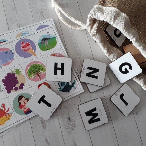 Incluye 9 cartones y 27 letras de 3x3 en MDF (versión en inglés 26 letras)